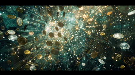 Cosmic abyss with floating coins and banknotes and radiant light bursts in panorama art