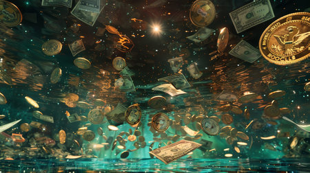 Floating banknotes and coins in a shimmering void illuminated by distant stars