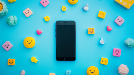 Modern smartphone displaying social media icons and emojis on a vibrant blue background, symbolizing online communication, digital marketing, and mobile app engagement
