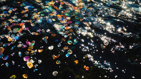 High-angle view of detergent bubbles, scattered across water surface, capturing natural shine and iridescent reflections