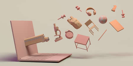 Online education concept with computer. Back to school. Screen with floating educational objects. 3D illustration. Copy space. Banner.