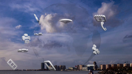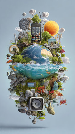 A smartphone appears to explode, surrounded by various electronic waste and craft materials, creating a vibrant and chaotic visual effect against a blue backdrop.