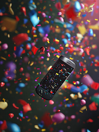 Mobile phone birthday. April 3. Phone surrounded by confetti. Copy space. Vertical format.
