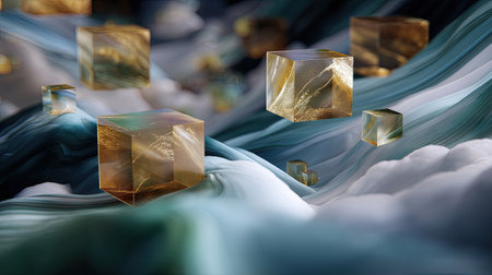 This captivating abstract 3D render features golden cubes floating gracefully among colorful waves and cloud-like forms, creating a surreal and dreamy atmosphere.
