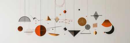 A hanging mobile featuring a mix of geometric elements in varying sizes and colors