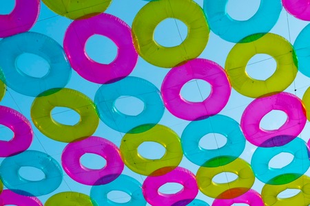 Colorful lifebuoy, decorated, hanging in the air, at Maharaj Peer.