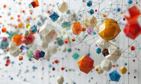 Geometric shapes of various colors forming a network diagram. --ar 3:2 Job ID: 305cebb8-b307-453a-ab97-539009d13575