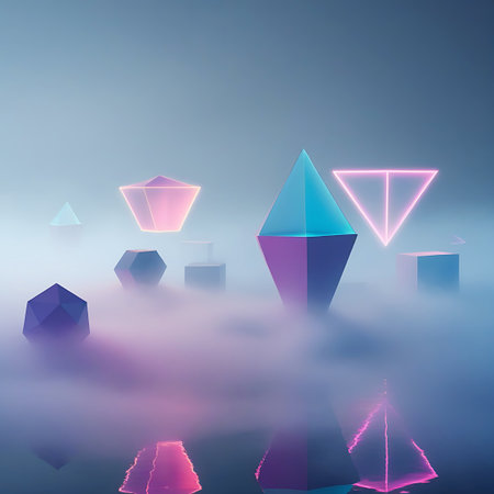A collection of abstract geometric shapes, including pyramids, cubes, and hexagons, float in a thick, ethereal mist. The shapes are illuminated by soft neon glows in shades of pink, purple, and cyan, casting reflections on the misty surface below. The background is a gradient of soft blues and grays, creating a dreamlike and futuristic atmosphere.