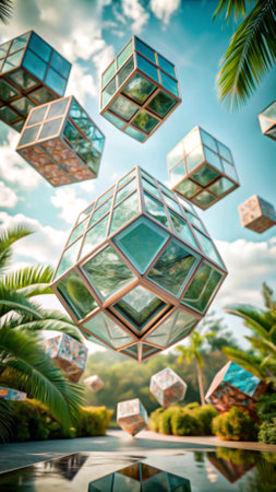 Reflecting urban energy through abstract 3D cubes in a modern landscape