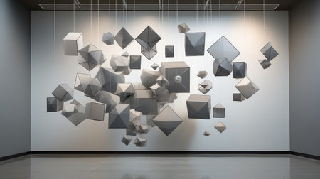 Colorful polyhedra suspended in mid-air form an intriguing display. Each unique shape and hue contributes to a captivating visual experience that draws attention and sparks imagination.