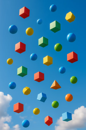A variety of colorful geometric shapes suspended in the bright blue sky with clouds
