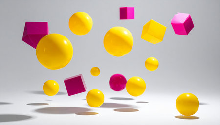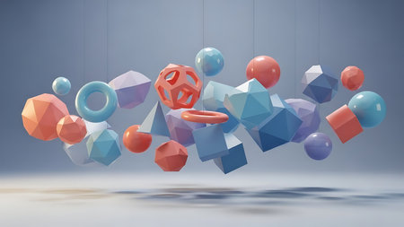Assortment of colorful 3D geometric shapes including spheres, cubes, and polyhedrons floating in a soft gradient...