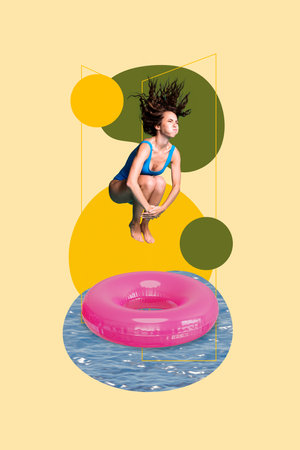 Colorful vertical photo collage young girl jumping into blue water pink circle float whole ocean sea have fun summer vacation