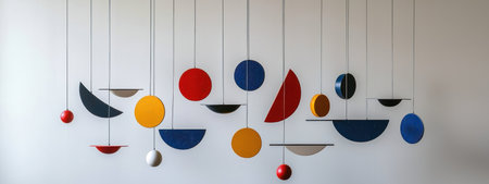 A Bauhaus inspired hanging decor with geometric shapes in vibrant colors like red, blue, and yellow, creating modern aesthetic