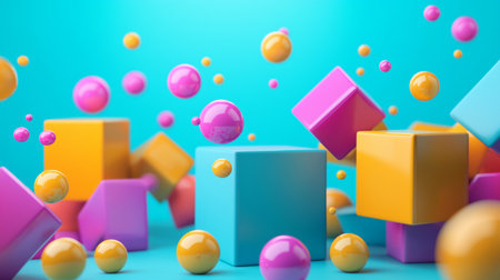 A playful composition featuring colorful cubes and spheres floating in a vibrant blue space, creating a modern and dynamic abstract scene.