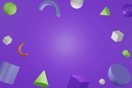3D abstract colored geometric shapes on purple color background.