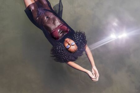 Beautiful young African American woman floating in a pool of water