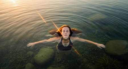 A young woman enjoys a peaceful moment, gently floating on calm water as the sun rises, embracing tranquility and nature's beauty.