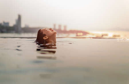 Beautiful asian woman smiling in a pool on summer vacation.