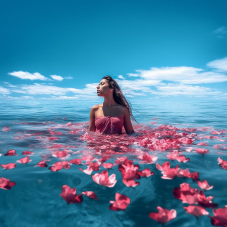 Beautiful woman swimming in water surrounded by tropical flowers