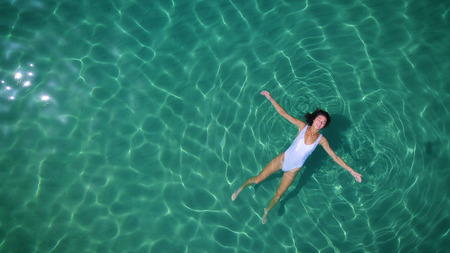 Beautiful young girl swims in the open sea or pool, in a white bathing suit, blue clear water, view from the top. Concept: sea air, warm water, summer, heat, travel, vacation, freedom, sun, enjoy, hot