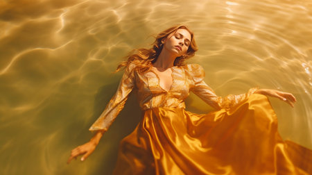 Beautiful young woman wearing a gold outfit, floating gracefully and weightlessly in the pool water. GENERATE AI