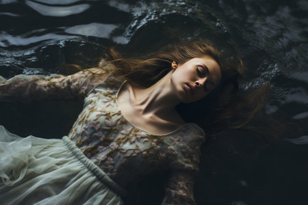 Young woman lying in a water in a poetic representation.