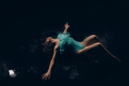 Ballerina teenager girl in green bodysuit dances against falling water drops on dark background. Graceful beautiful ballerina. Ballet art, grace, flexibility, motion. Top view.
