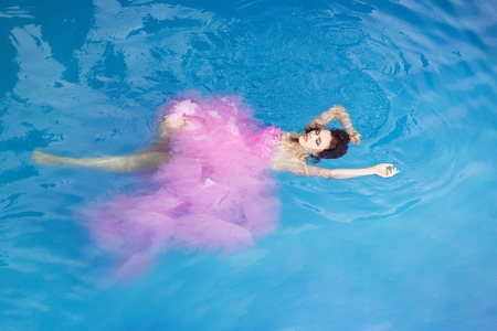 young sexy woman or girl with pretty face and wet hair in glamour fashionable pink dress swimming in pool with blue water summer day outdoor