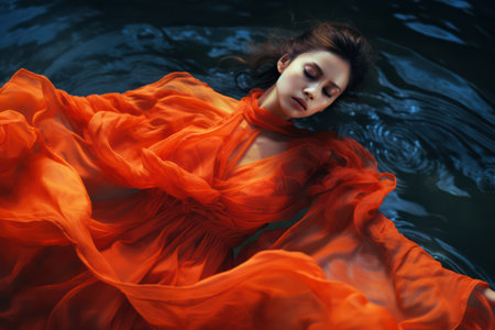 A woman in an orange dress floating under water. Generative AI image.