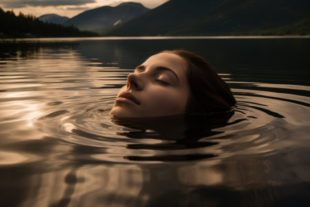 A serene young woman, eyes closed, floats effortlessly in calm water Dressed in a black top, she embraces the tranquility of nature, radiating peace and inner balance The beautiful outdoor setting enhances the feeling of calmness and serenity, inviting viewers to find their own moment of peace AI Generative
