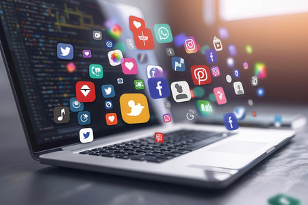Laptop with colorful application icons on the screen, social media concept