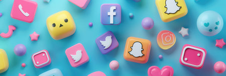 A vibrant background with colorful 3D social media icons arranged on a bright blue surface. Ideal for promoting social media marketing, advertising agencies, and digital campaigns.