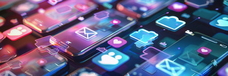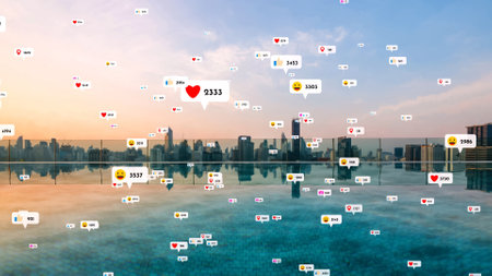 A collection of smartphone screens featuring colorful like and comment icons, representing activity in a lively social media landscape.