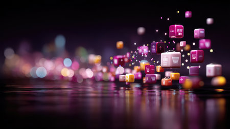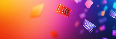 Vibrant floating icons illustrating online shopping and digital commerce create a visually appealing scene, showcasing modern technology in a captivating layout.