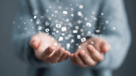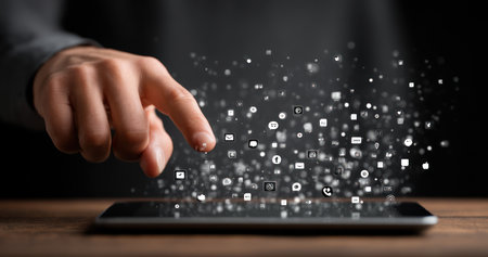 A person's finger hovers above a tablet, interacting with a constellation of digital icons. The image displays a shallow depth of field, focusing on the hand and glowing icons against a dark background. The scene suggests a connection to communication, data, and technology, potentially suitable for various commercial purposes.