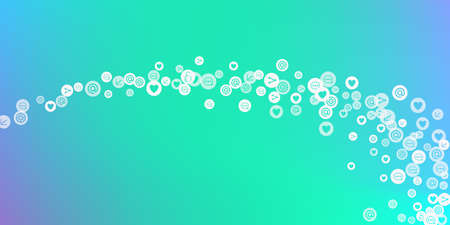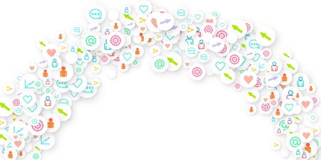 Social media marketing, Communication networking concept. Random icons social media services tags on color background. Comment, friend, like, share, target, message. Vector Internet concept.