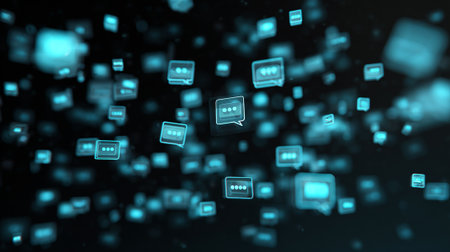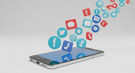 Bright chat bubbles are bursting from a smartphone on a blue table while showcasing vibrant social media icons during an engaging interaction.