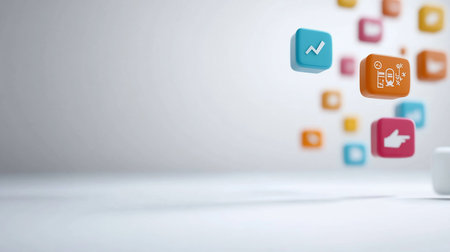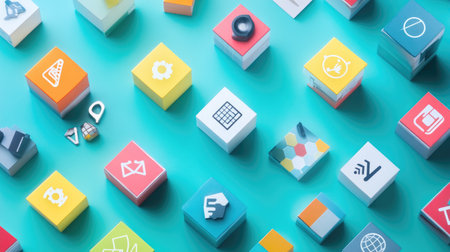 A vibrant collection of flat design icons arranged on geometric blocks, perfect for showcasing modern digital artwork and creative concepts for various projects.