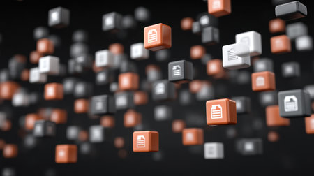 This digital artwork showcases a dynamic 3D environment with floating file icons, representing cloud storage and network connections in a futuristic grid layout.