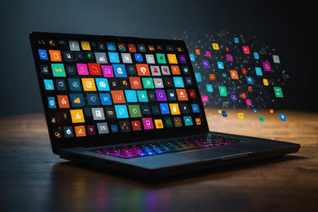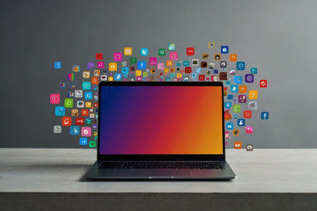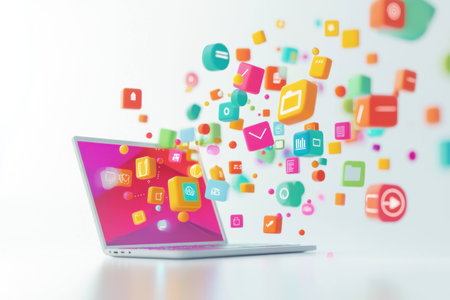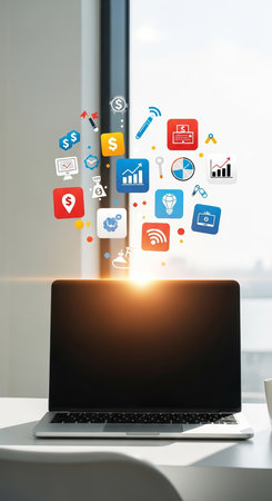 Vibrant digital interface with colorful icons emerging from a laptop, representing technology, creativity, and innovation in a modern workspace