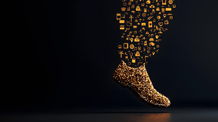 Golden glitter shoe on dark background with media icons. 3D rendering