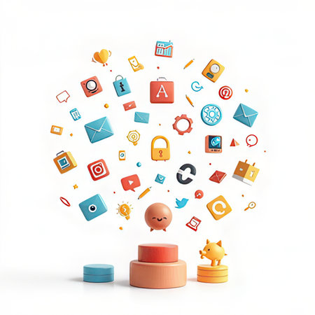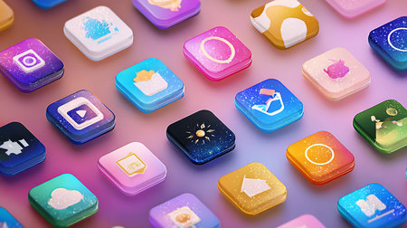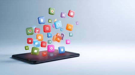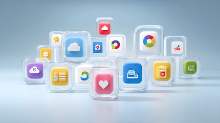 This image showcases a collection of colorful app icons creatively arranged in transparent blocks, symbolizing digital tools and modern technology.