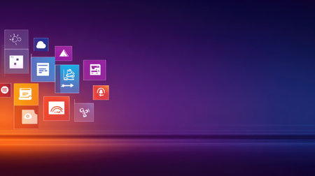 Vibrant gradient background featuring various digital icons that symbolize innovation, technology, and communication. Ideal for dynamic designs and concepts.