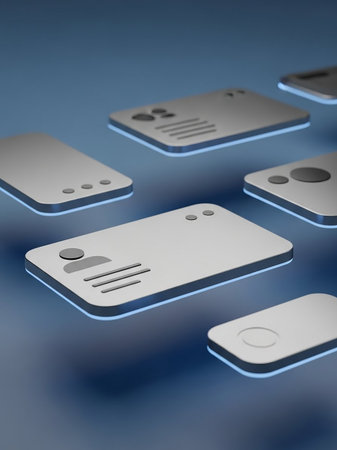 A 3D render depicts several abstract digital identity cards floating on a blue gradient background, each featuring simple icons.