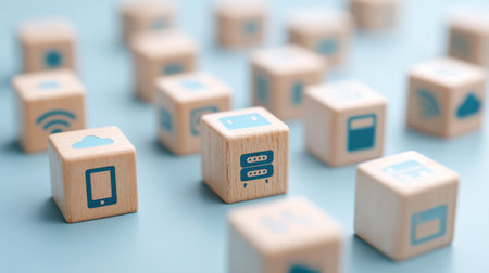 Wooden Blocks Connected in a Network Showing Various Technology Icons, generative Ai