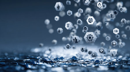 Stunning abstract digital background featuring floating icons and symbols to represent various industries, technology, and data-driven innovation, illustrating connectivity and creativity.