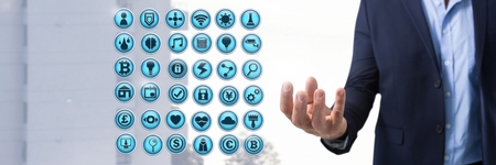Digital composite of Various app icons and Businessman with hand palm open in city