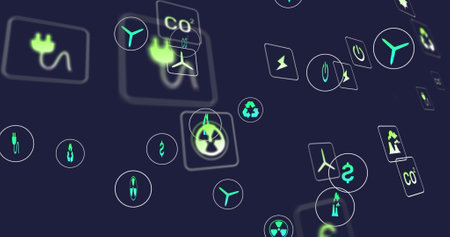 Environmental icons and sustainability concepts image over dark background with glowing dots. eco-friendly, renewable, recycling, green, conservation, biodegradable