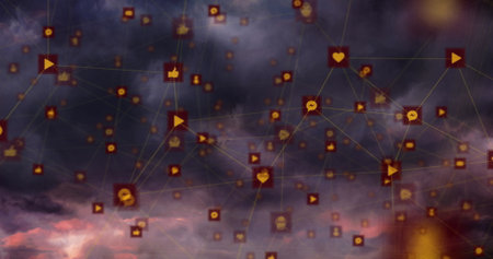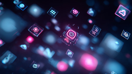 This captivating abstract image showcases a vibrant digital network of 3D icons interconnected by luminous lines against a cosmic background. Perfect for technology themes.